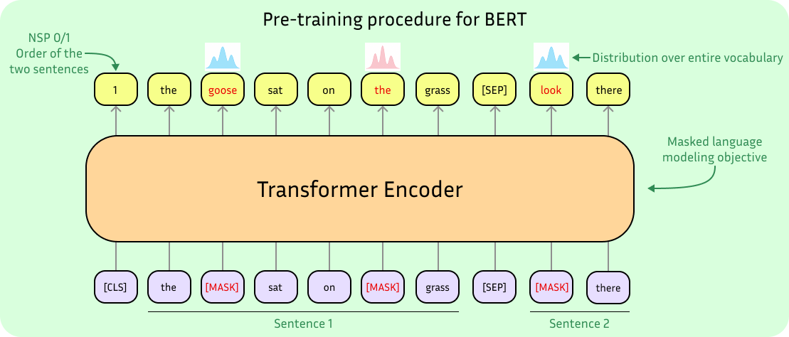 In addition to this, BERT also uses a Next Sentence Prediction (NSP) objective. This auxiliary task helps the model understand sentence-level relationships by training it to predict whether one sentence logically follows another within a pair. Cool idea, but not really something you can transfer over to single images.