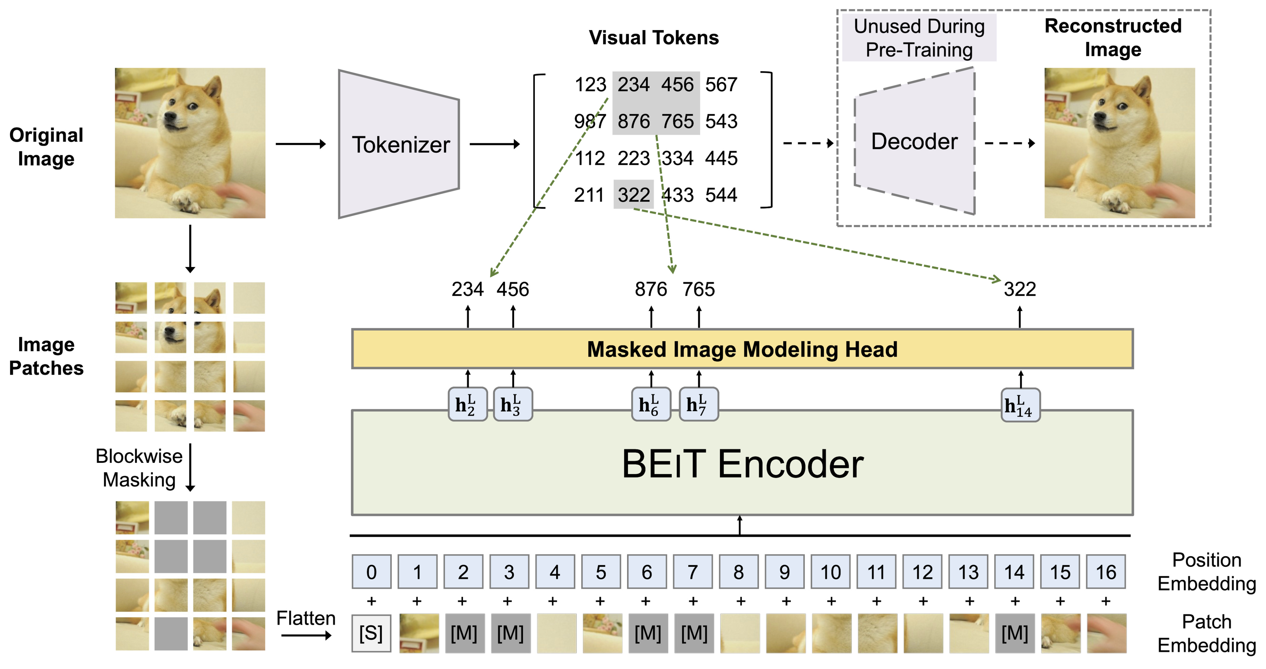 A random subset of pixel patches is masked and replaced with a special [MASK] token, and the model is trained to predict the corresponding visual tokens at those positions using the context. Since the visual dVAE tokens are discrete, the model outputs a distribution for each masked position and now trains exactly like BERT. Notably, BeiT requires no architectural modifications to ViT, so the resulting encoder can be directly used for downstream tasks!