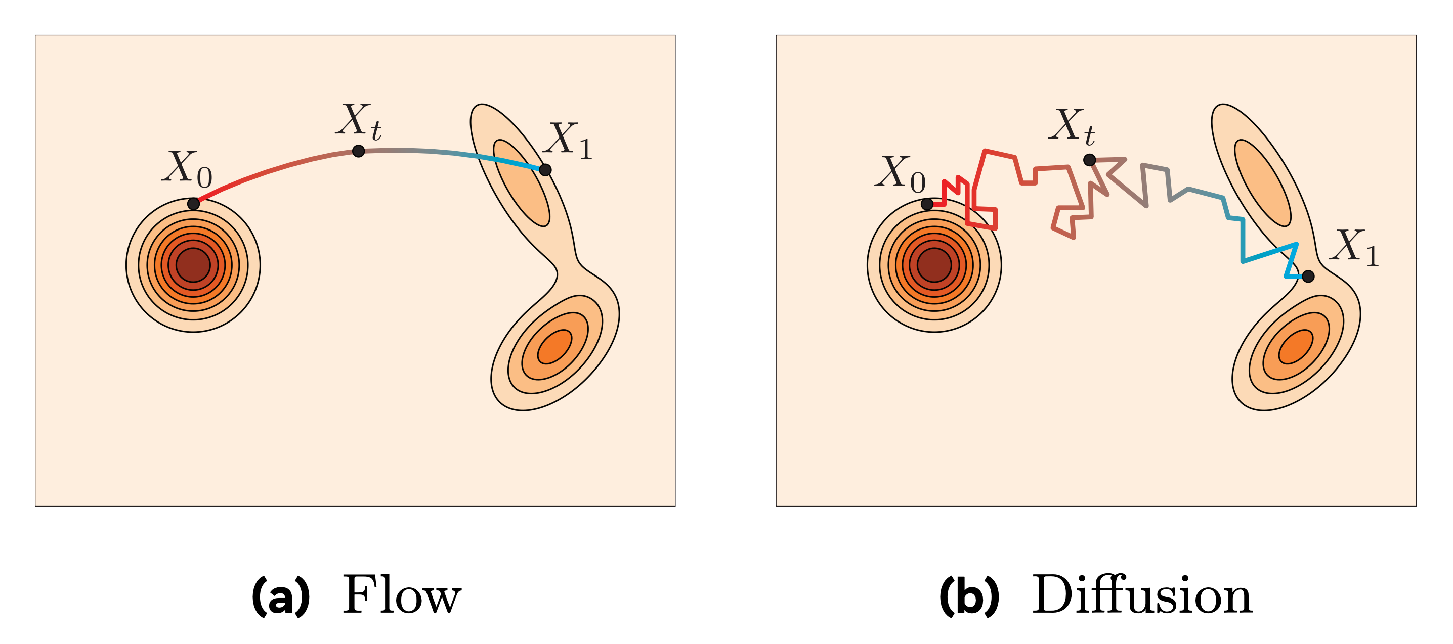 Both frameworks define a probability flow between a noise distribution and the data distribution.