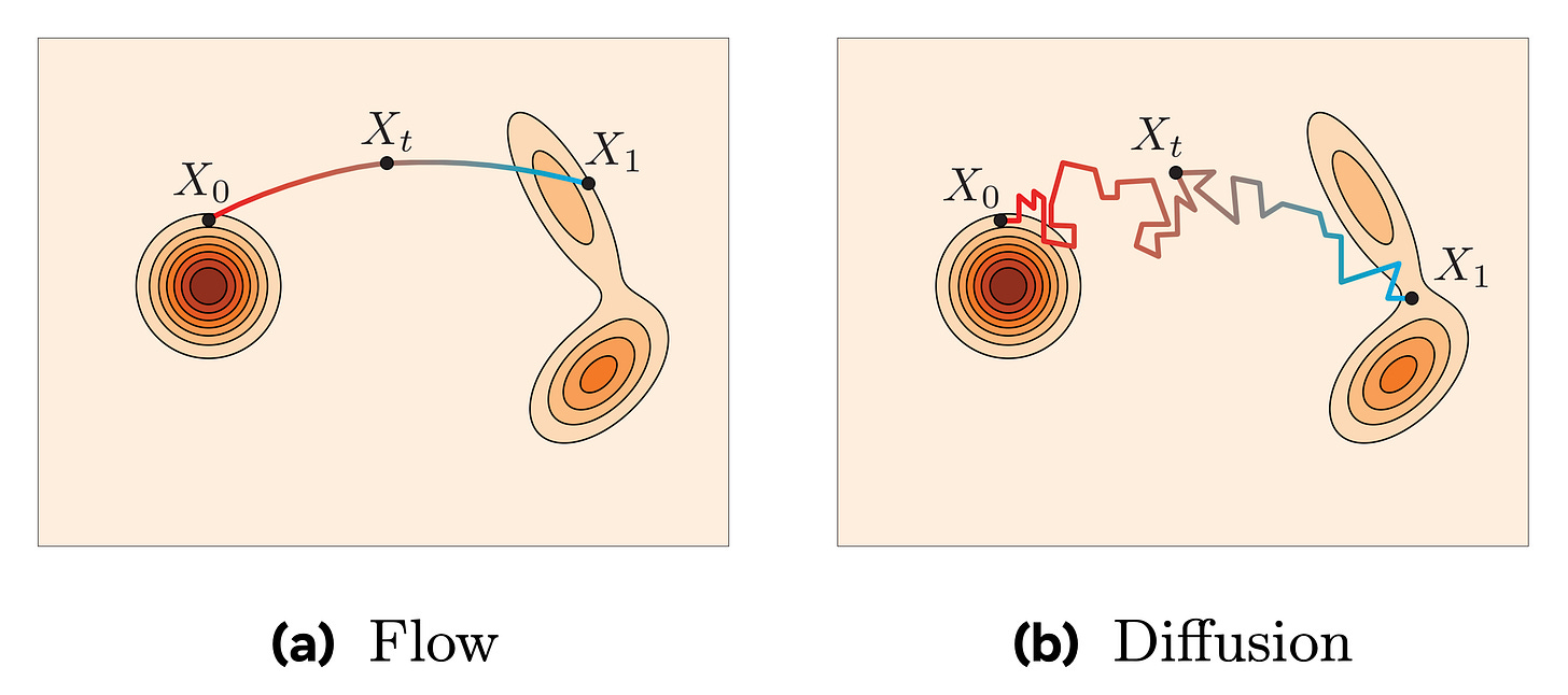 Furthermore, flow matching is a more general framework: diffusion appears as a special case only when one uses Gaussian perturbations with a specific noise schedule. Technically speaking, flow matching allows for broader choices of forward and reverse paths, although there would be little reason not to use Gaussian noise and a straight linear interpolation for most cases…