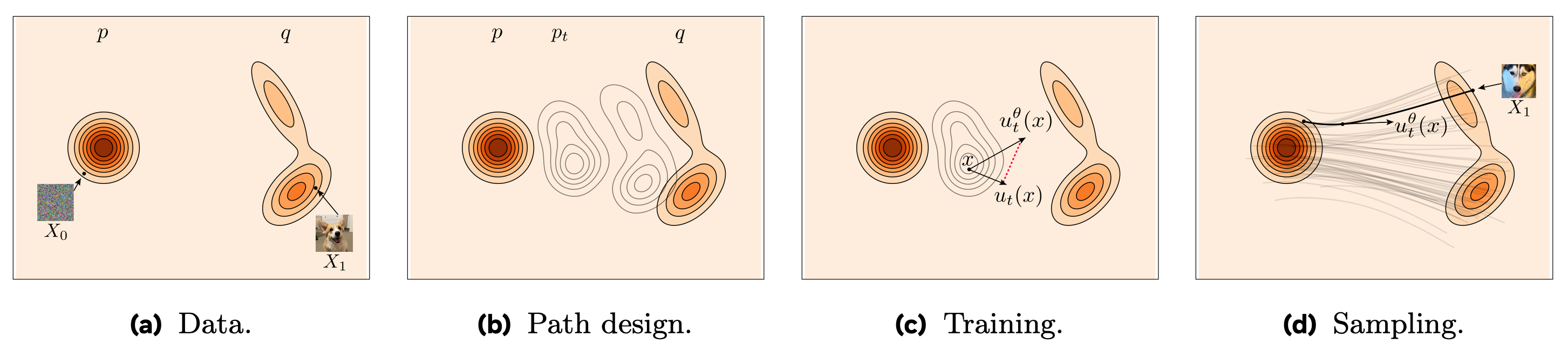 Crucially, in the linear interpolation setting between the two distributions, the path from x to ε moves at a constant “speed” in data space, so the instantaneous velocity field is the same for all t! This deterministic trajectory makes the learned model suitable for fast sampling via first-order solvers, and on top of this, it is also optimal in mathematical terms [1].