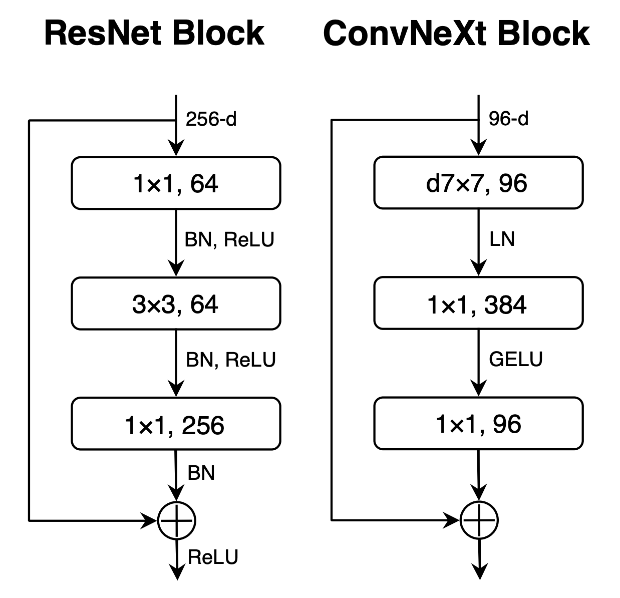 In a standard ResNet block, the main 3×3 convolutions mix both spatial and channel information at once. This coupling is powerful but also expensive, and that’s why ConvNeXt adopts depthwise convolutions instead.