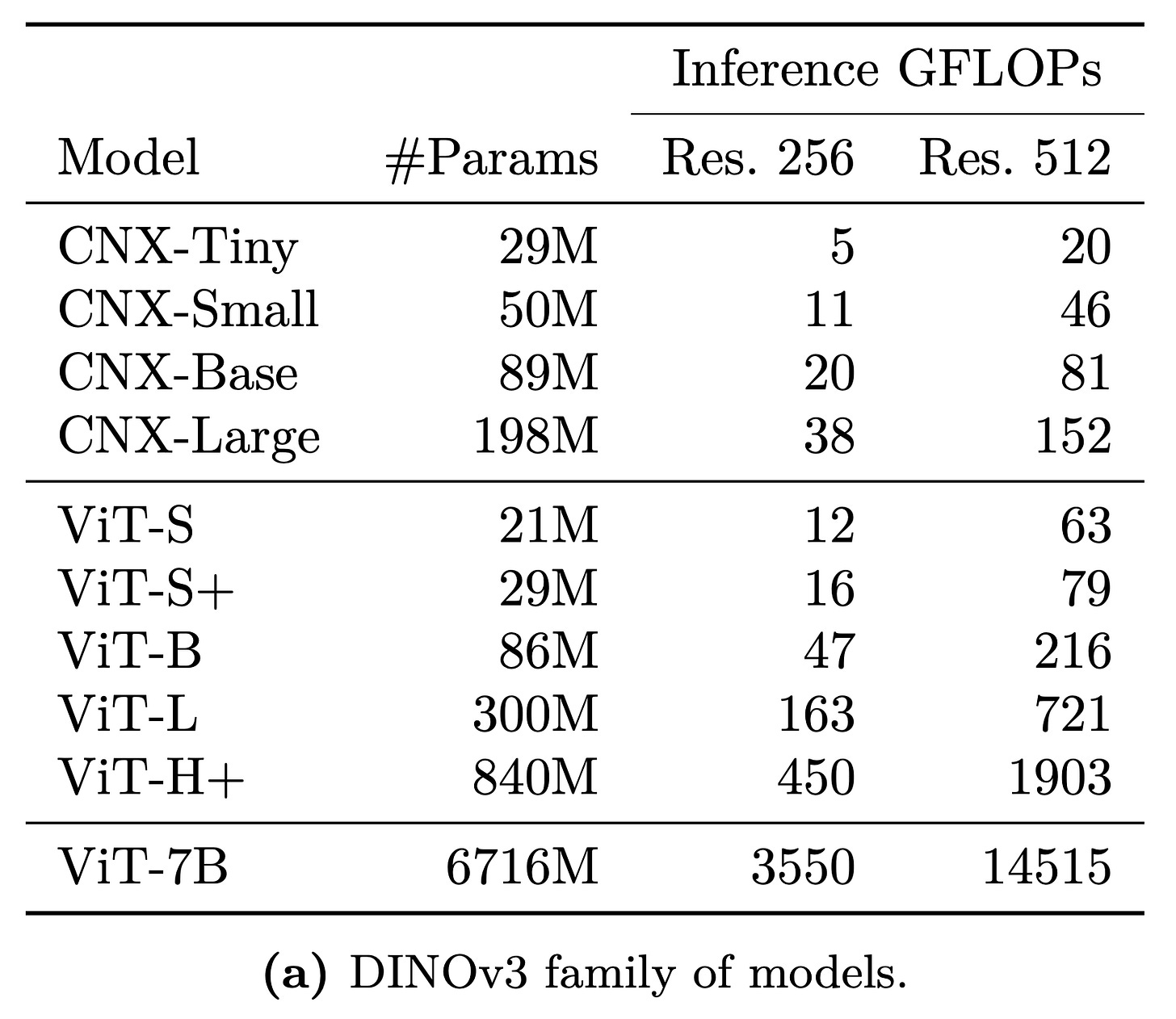 With these refinements, the ConvNeXt architecture emerged. It is modern, efficient, and powerful, combining the strengths of convolutional networks with the design principles of transformers. However, you might ask: why use a CNN when transformers exist? The answer lies in FLOPs! ConvNeXt models allow inference with larger architectures or higher image resolutions than ViT for a fixed computational budget, offering a better frontier between performance and efficiency. See the table below to get an idea: