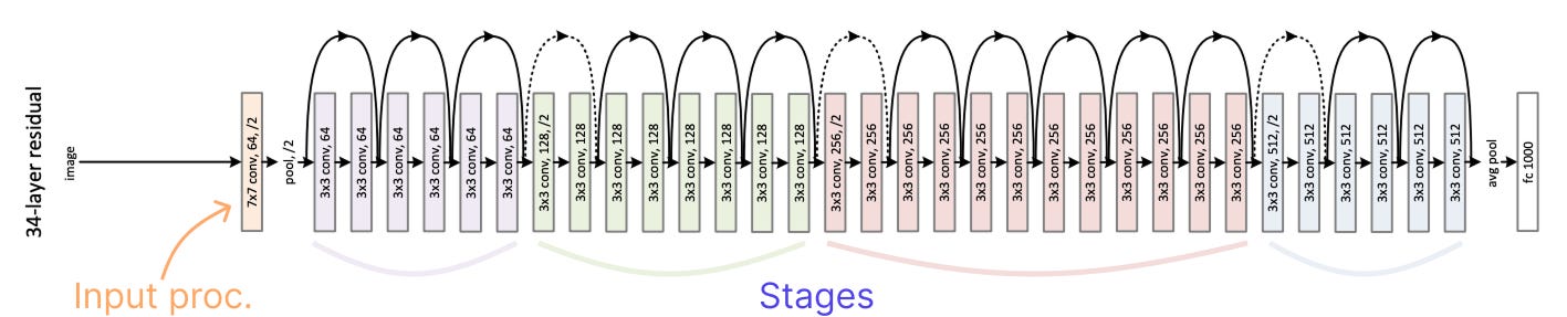 ResNet is divided into four stages, each made up of several residual blocks that operate on feature maps of the same spatial resolution. The resolution decreases only when transitioning from one stage to the next, typically by a factor of two through a stride-2 convolution.