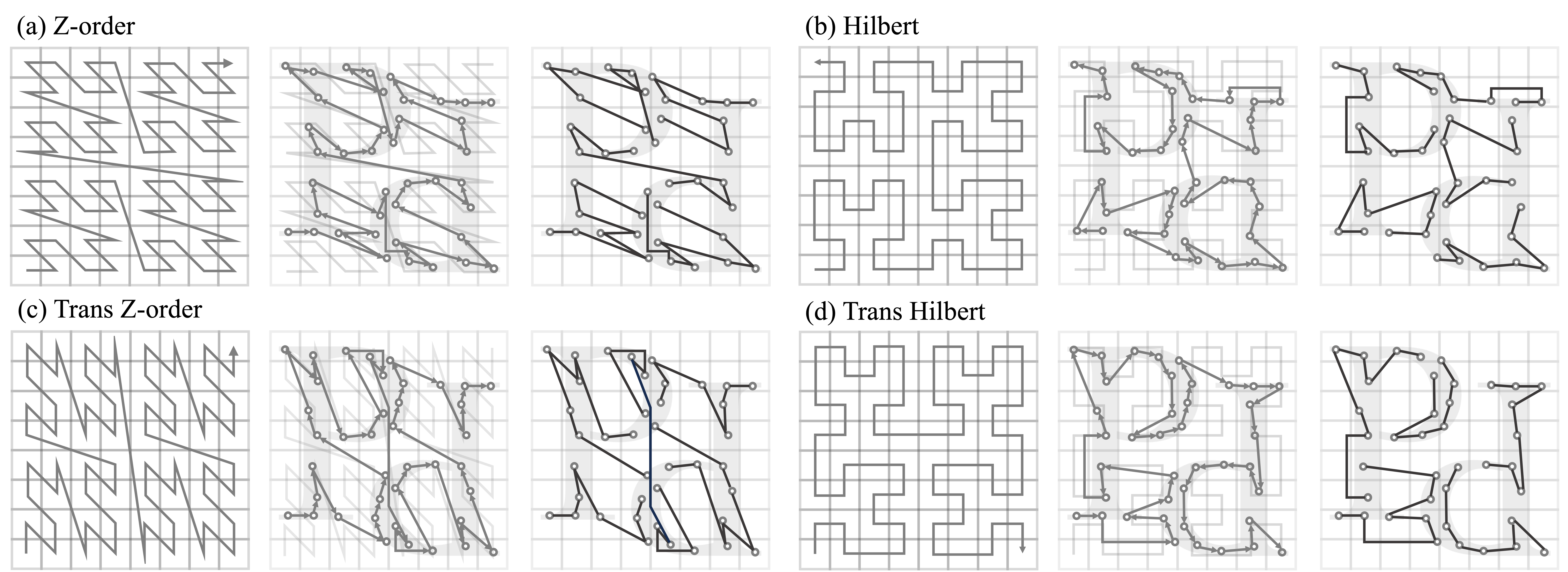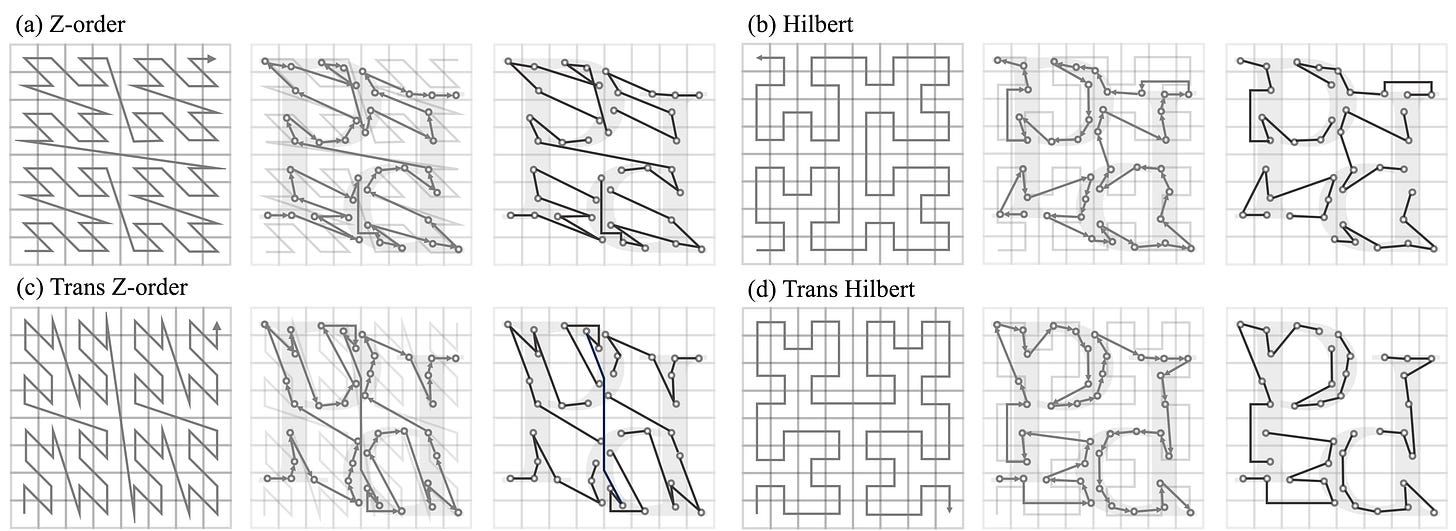 The first is Point Transformer V3 (PTv3), the latest iteration of a transformer-based backbone for processing of point clouds. To handle their unstructured nature, PTv3 introduces point serialization via space-filling curves. Simply put, we traverse every point in 3D according to a set of predefined logic, effectively mapping the data into a manageable 1D sequence while preserving spatial proximity to a significant extent. Its four serialization patterns are shown below.