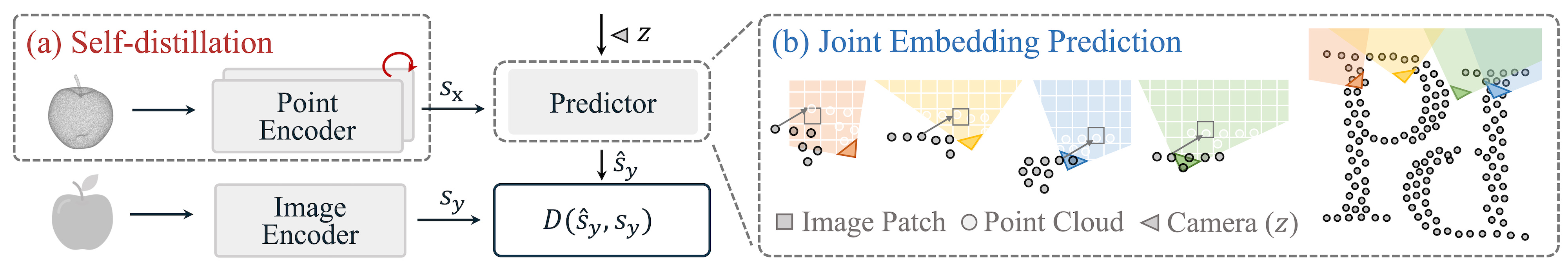 Cross-modal alignment (the semantic teacher). This is the introduced novelty, following LeCun’s Joint Embedding Predictive Architecture (JEPA), which advocates learning by predicting latent representations across modalities. In this setup, the student model (processing the 3D point cloud) employs a predictor head to approximate the representations produced by the frozen 2D teacher. The alignment mechanism is explicit: for each image patch, the model computes the mean of the features of the points that project into it, and maximizes cosine similarity with the image counterpart, effectively forcing the 3D features to align with the semantic concepts in 2D.