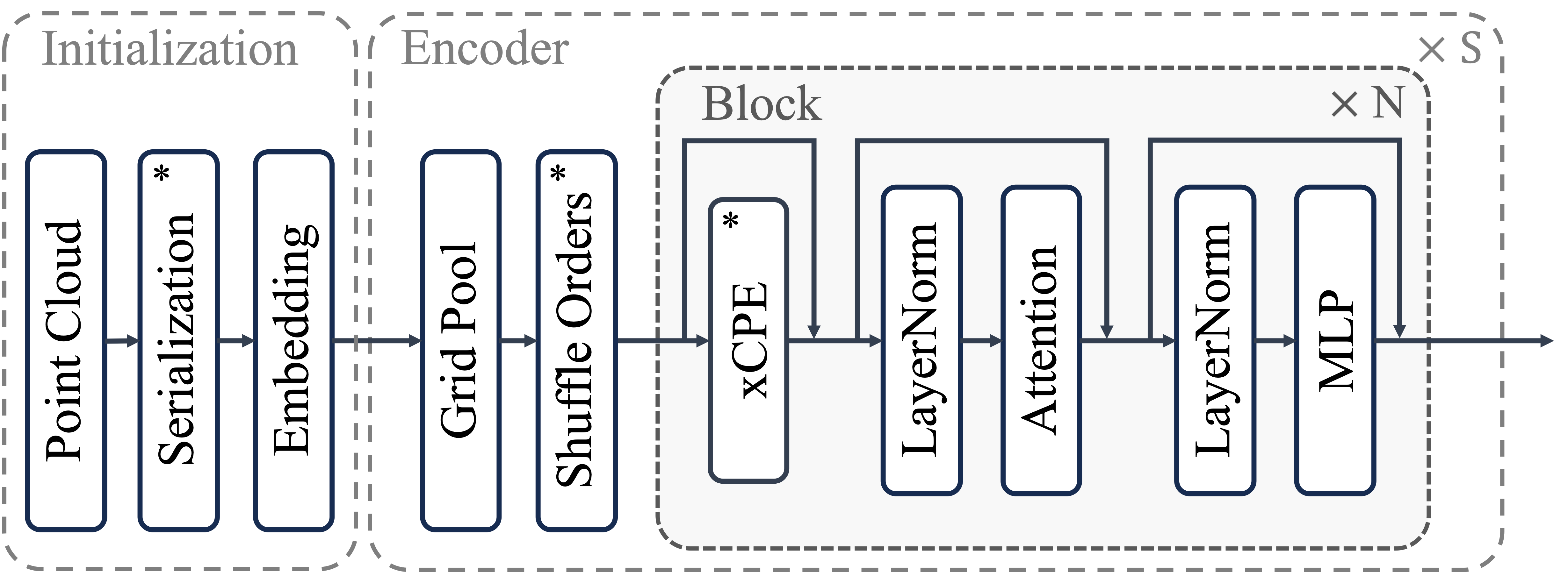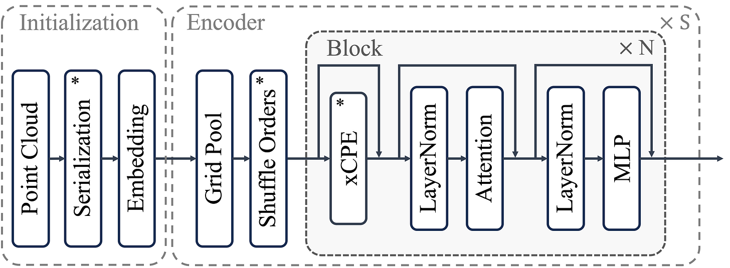 Overview of the serialization process. Left: four space-filling curve patterns used for serialization. Middle: resulting 1D point sequence sorted via the space-filling curve. Right: serialized points grouped into patches for local attention. From [3]. This allows the model to apply standard efficient attention mechanisms after local grouping, scaling to large scenes efficiently without any custom design. While the original architecture of PTv3 consists of a four-stage encoder and decoder (similar to a U-Net), only the initialization + encoder part is kept here.