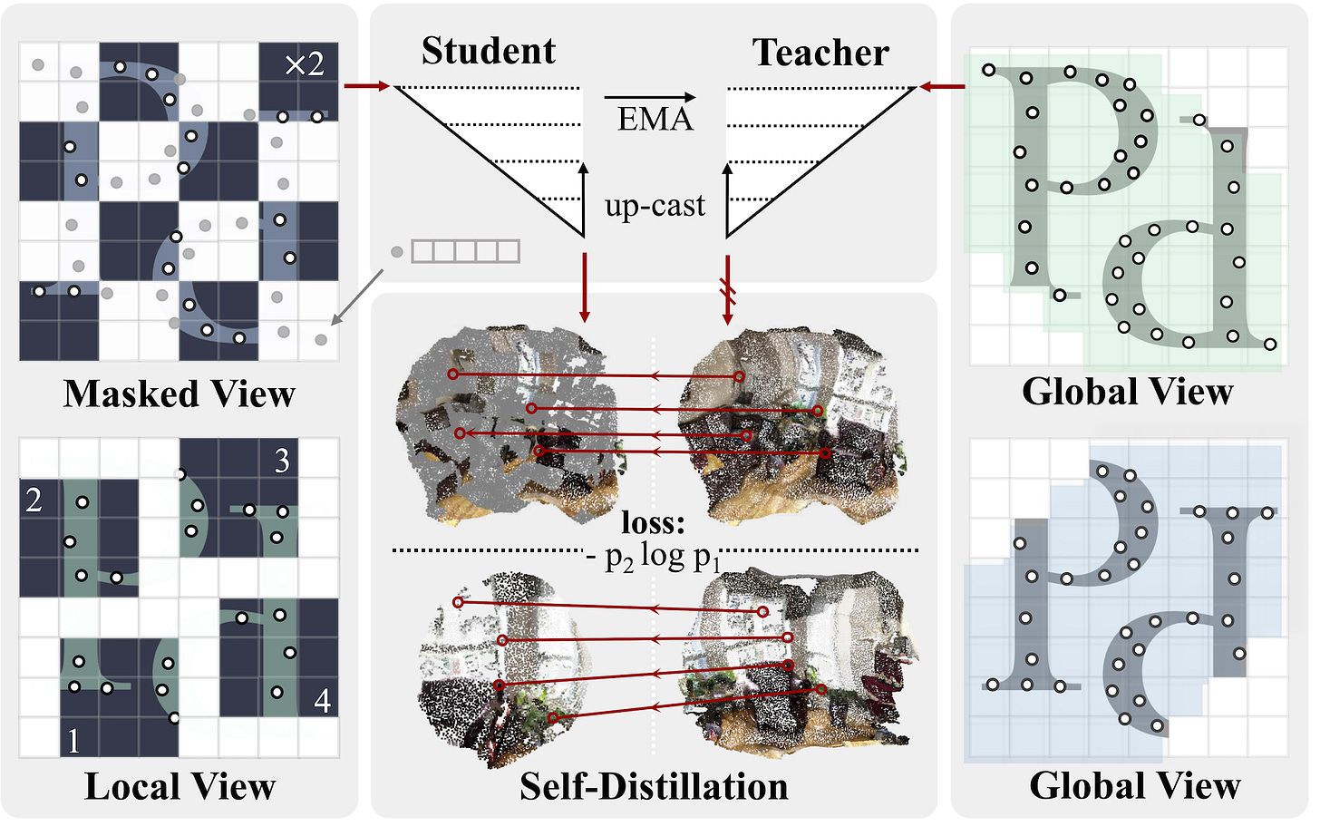 The second is Sonata, a DINO-like self-supervised learning framework built on top of PTv3. In practice, it takes multiple views of the same 3D scene, applies random spatial (crop, rotate, distort) and photometric (jitter) augmentations, then trains by matching the embeddings of points that are the same. However, since geometry alone encodes substantial information (e.g., via surface normals), masking is used to prevent the model from taking easy shortcuts. Similar to DINO, local and masked views are passed to the student, while the teacher processes global views.