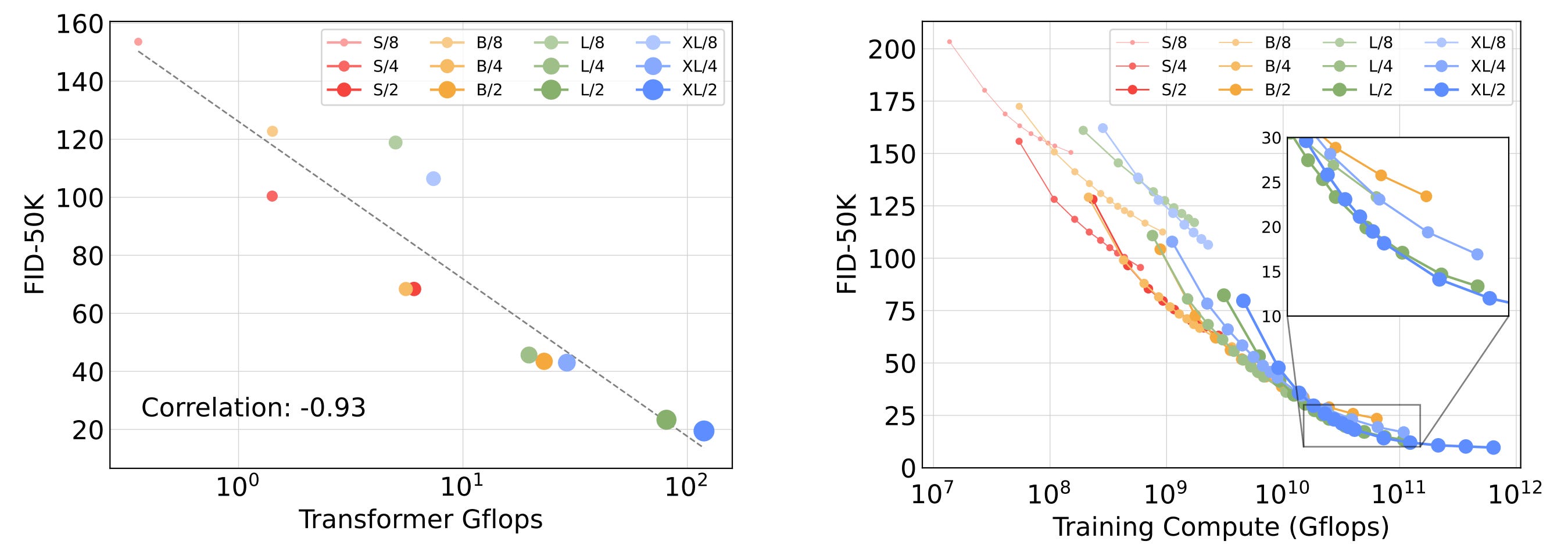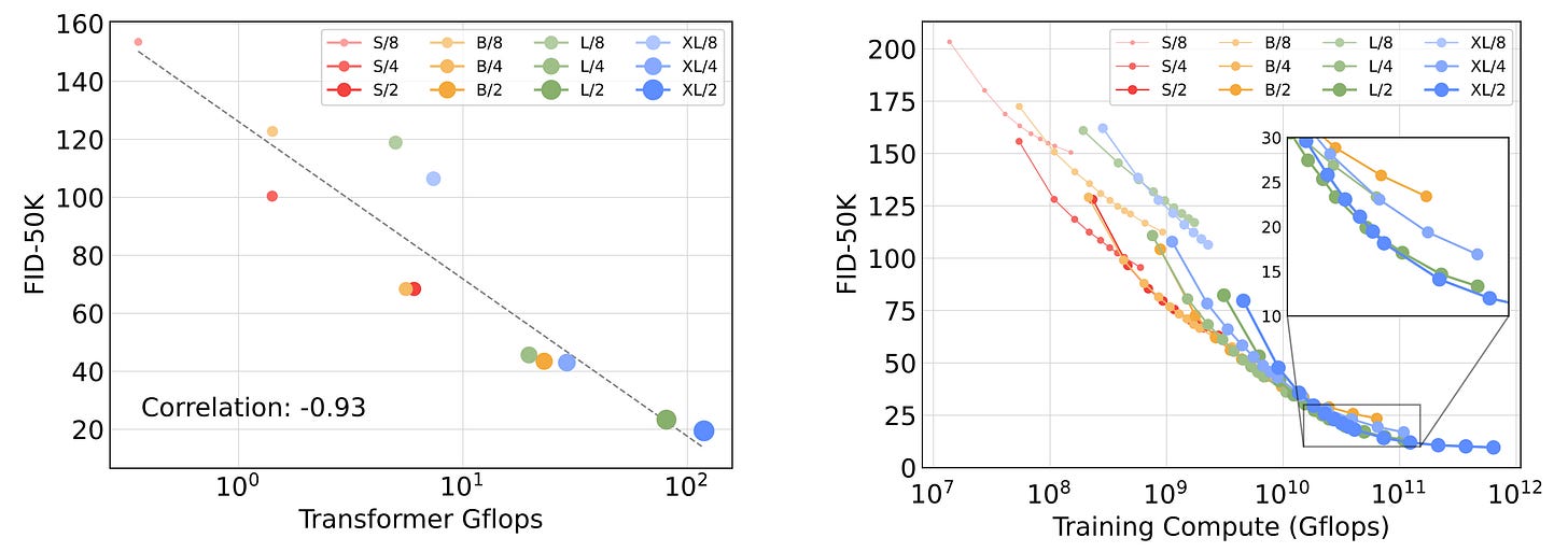 While DiT outperforms U-Nets, this was not the only takeaway message. The goal of [1] was to demonstrate that diffusion models based on transformers can scale as predictably as LLMs. To prove this, the authors conducted an extensive study across varying model configurations and compute resources.