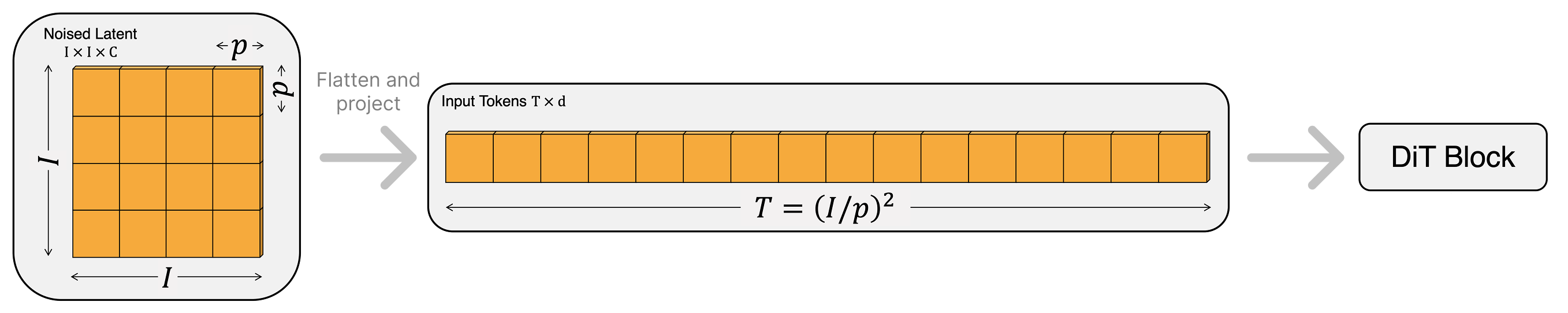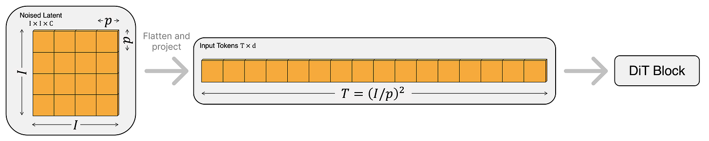The latent, shaped like a VAE encoded image, is divided into non-overlapping patches with a small patch size (e.g., 2x2), each flattened and linearly projected into a token embedding. From [1]. For example, if we use a patch size of 2, the model groups every 2×2 window of “latent pixels” into a single block. Continuing the example with 16 channels per pixel, one patch would contain 2×2×16 = 64 raw values. This block is then flattened and linearly projected into the embedding dimension D (e.g., 768) used by the transformer. The result is a sequence of tokens of shape N×D, where N equals (H·W)/patch_size², ready to be processed just like regular amodal tokens.