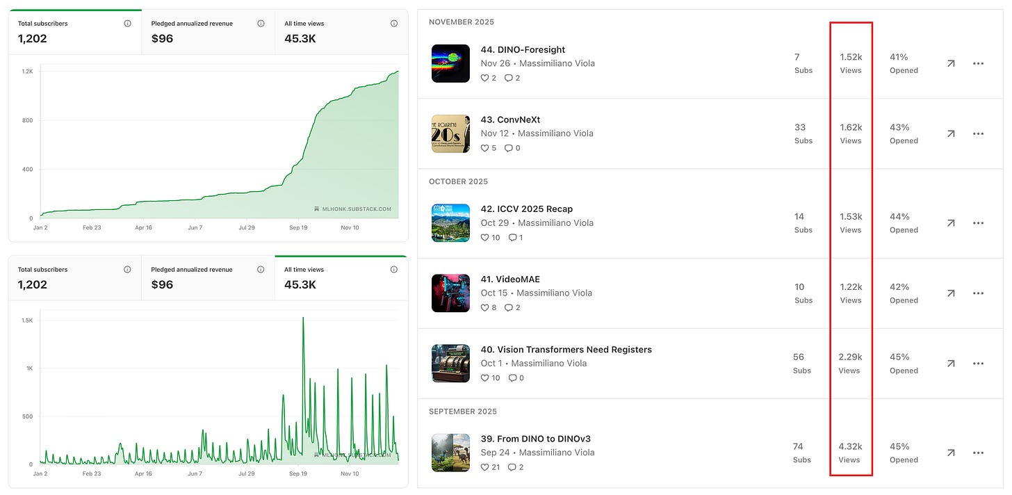 At least two high-quality posts every month. These will be the classical in-depth analyses, where I explain the core mechanics of a paper and why those specific findings matter for the field. By moving away from a strict weekly schedule, I can curate more comparisons between different approaches and provide a recap of entire lines of work, helping you see the bigger picture. I have already planned several topics, including the SAM to SAM 3 evolution (following the success of DINO to DINOv3 saga) and a recap of feature super-resolution methods.