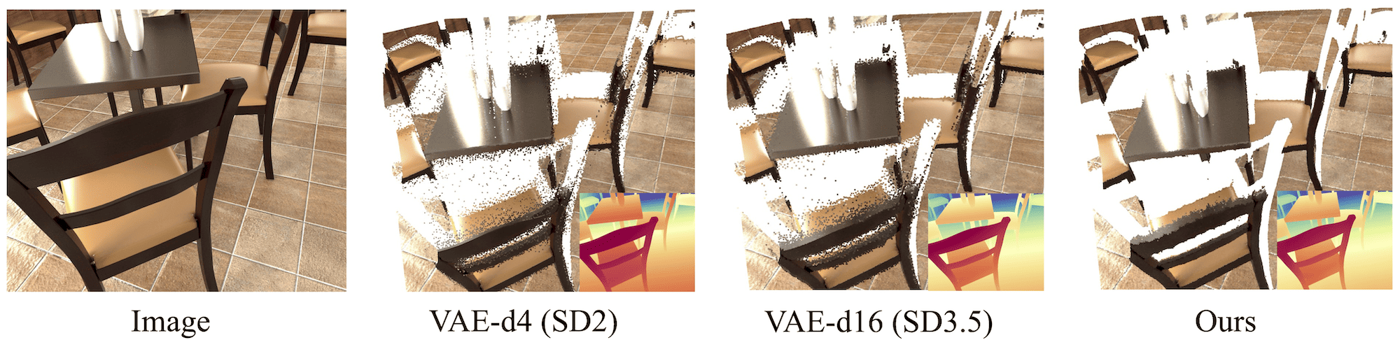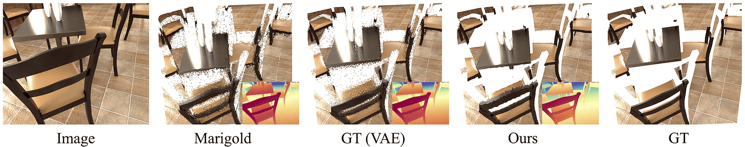 In generative depth estimation, practically all recent models use a latent diffusion process to keep computational costs manageable. This mirrors the widely successful strategy used in image generation, and is possible because pretrained Variational Autoencoders can work with normalized depth maps by treating them as grayscale images. All the details are explained in my previous post about Marigold, so if this doesn't make sense so far, go check it out!