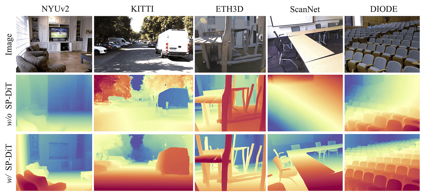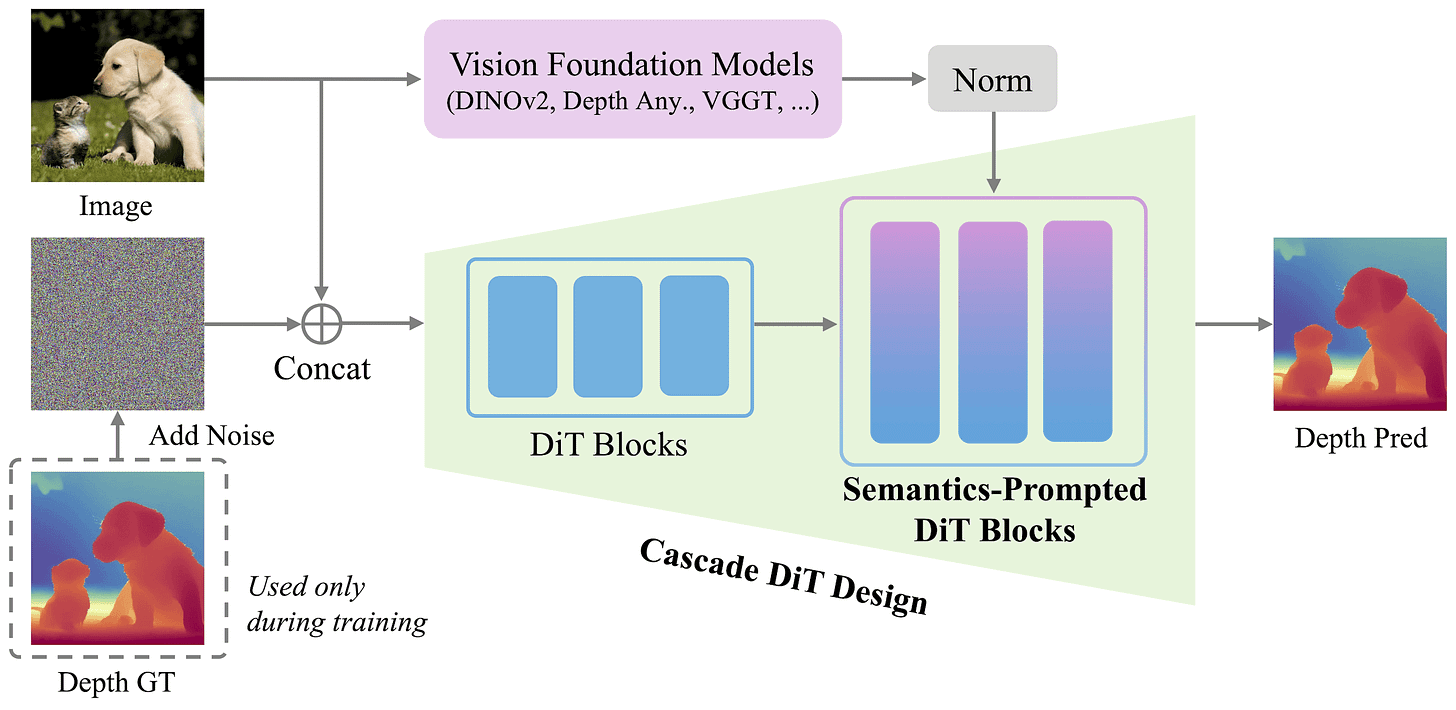 To fix this, the authors introduce the SP-DiT mechanism, which acts as a semantic compass for the diffusion process. In summary, it takes the input image and runs it through a frozen ViT encoder to extract high-level semantic representations (figure above). This can be a generalist one like DINO, or the fine-tuned ViT encoder from depth models like Depth Anything or VGGT. Because the magnitudes of these patch features may differ from those of the internal DiT tokens, the semantic representations are first normalized. Then, they are resized with bilinear interpolation to match the DiT patch size, concatenated channel-wise, and fused into the SP-DiT blocks via an MLP. In PPD, the first 12 blocks (the coarse stage) go without these prompts, while the remaining 12 blocks are SP-DiT blocks.