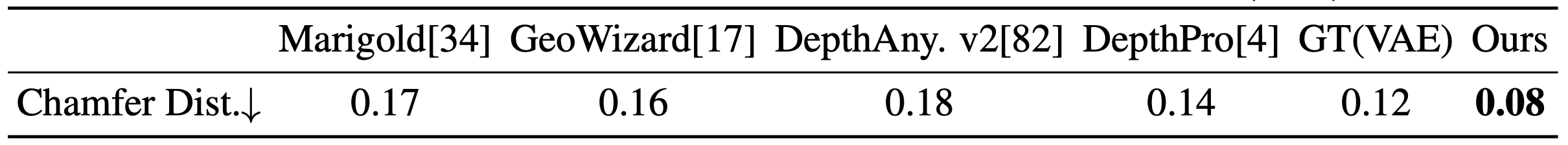 However, the main observation of PPD is that this lossy compression introduces a geometric bottleneck manifested as flying points at edges. In other words, the paper claims that latent diffusion-based backbones generate decently sharp depth maps, but the maximum quality is ultimately upper-bounded by the VAE itself. The easiest confirmation is the visual comparison here, where the GT after encoding and decoding — GT (VAE) — introduces flying points compared to the original GT.
